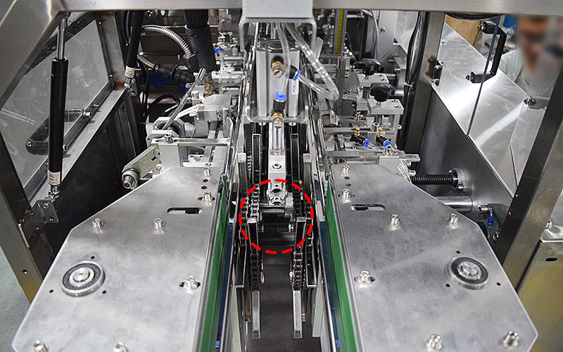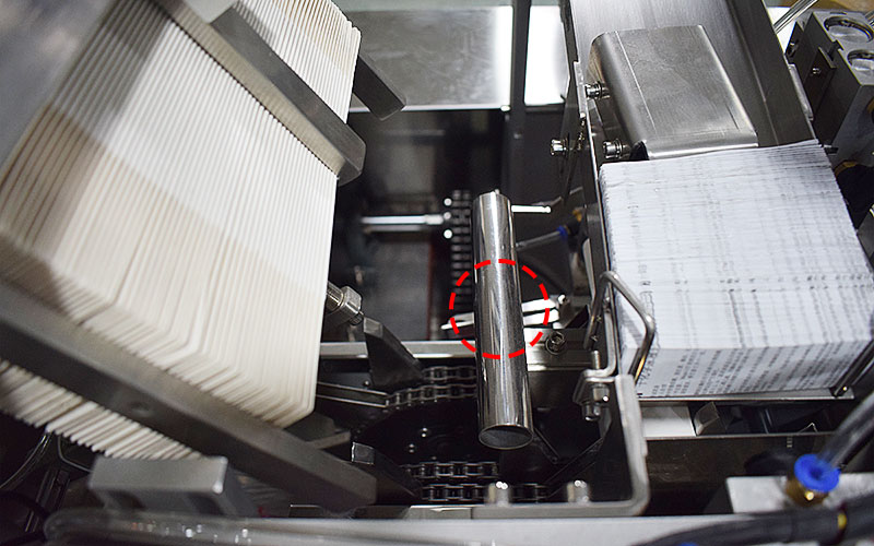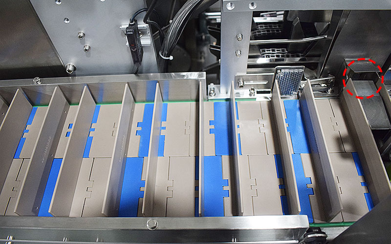 机器包装内部输出口;纸板仓自动开盒、进料、折耳、折页、粘胶成型完成包装。