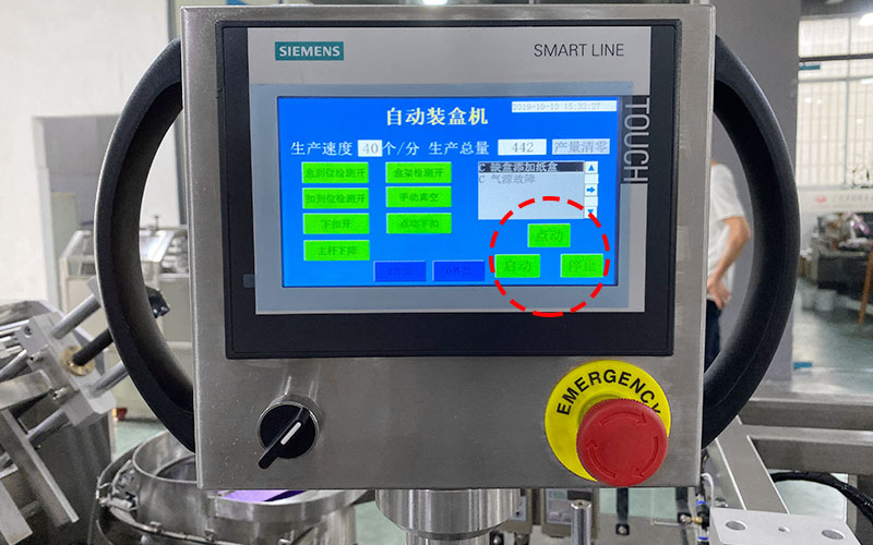 更具有产品进盒不到位或卡料自动停机,缺纸盒自动报警,无产品不开盒,触摸屏自动显示故障,并停机报警,显示机器操作及维修方式。