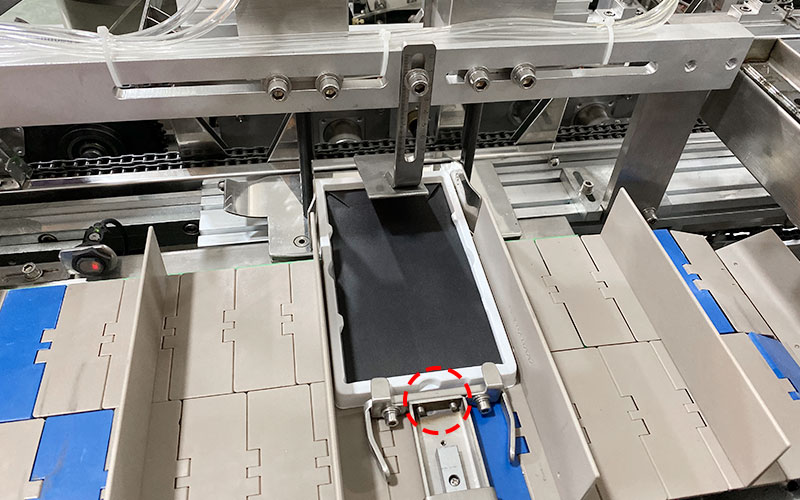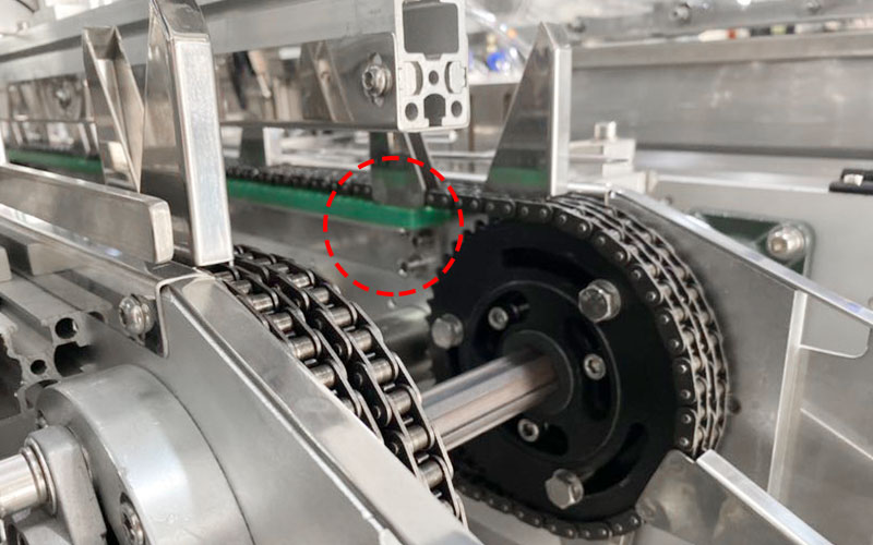 机器传送带;传送带前端需人工手动去放料,再自动送料到达指定位置进行装盒。